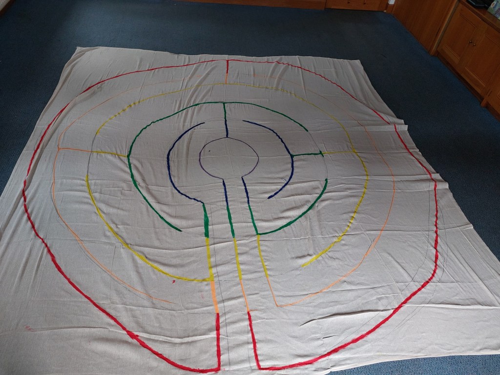 I bought a dust sheet that would be big enough and looked up online how to draw one. Then I got a paint can to mark the middle and drew 6 circles in crayon. Then I marked the extra ‘vertical’ lines that would mark out the path. And after that took me a couple of hours and much frustration, I got out the fabric paint. I started to paint over the crayon lines so that it would be permanent.