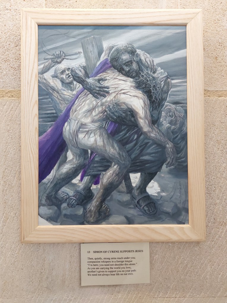 Jesus, already bruised, bloodied and weakened, is made to carry his cross through the streets to the hill of execution. Not just the cross bar, but the whole thing. The crowd jeers at him, they spit at him and the soldiers are all to ready with their floggers. He falls, collapsing under the weight of the cross and the flogging, but the crowd don’t help. Except one. Simon of Cyrene shares the burden, the insults, the whipping. He carries the cross with Jesus. And the insults continue and the beatings continue and Jesus still has to carry the cross up the hill. Brutal.